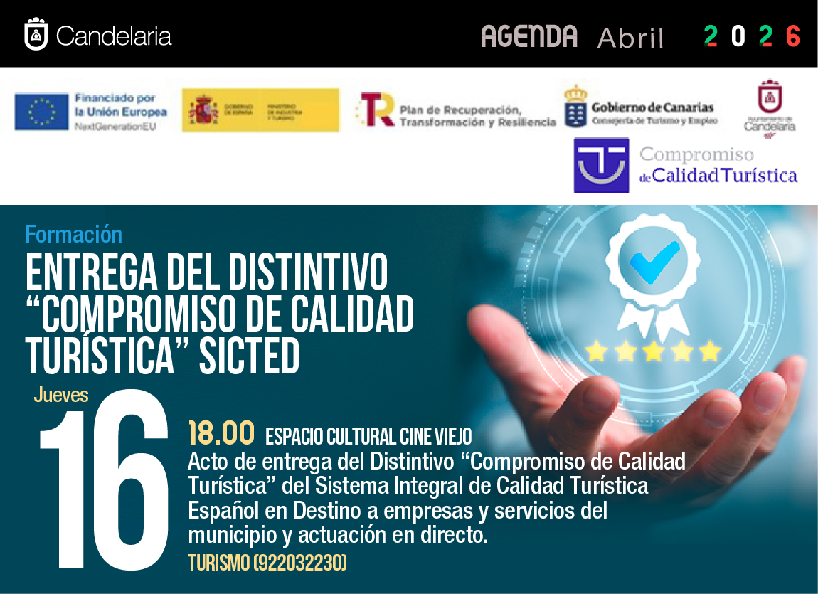Zeitplan: 18:00 Verleihung des Distintivo “COMPROMISO DE CALIDAD TURÍSTICA” del Sistema Integral de Calidad Turística Español en Destino an Unternehmen und Dienstleistungen der Gemeinde; mit Live-Auftritt.
