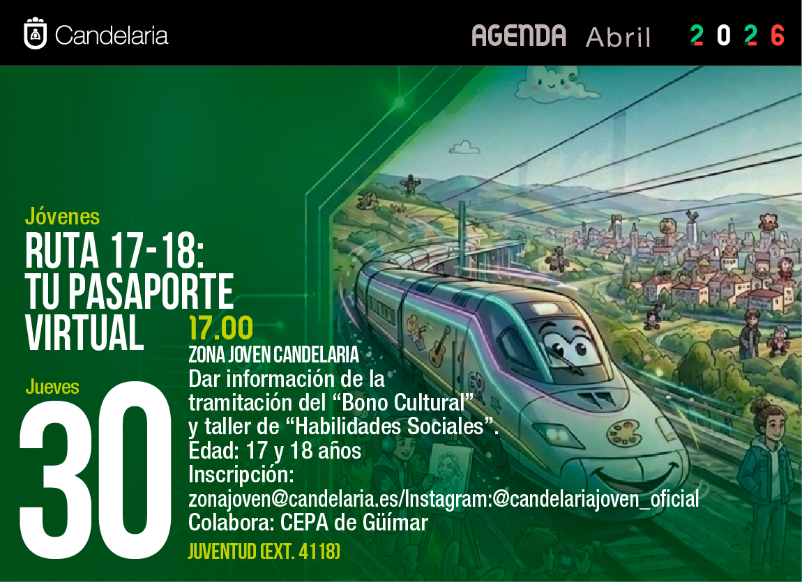 Ruta 17- 18: Dein virtueller Reisepass. Informationsveranstaltung in der ZONA JOVEN CANDELARIA.\n\n17:00 ZONA JOVEN CANDELARIA\n- Informationen zur Abwicklung des „Bono Cultural“ und zum Workshop „Habilidades Sociales“\n\nAlter: 17 und 18 Jahre\nAnmeldung: zonajoven@candelaria.es/Instagram:@candelariajoven_oficial\nIn Zusammenarbeit mit: CEPA de Güímar\n\nDetails\n- Datum: 30. April\n- Uhrzeit: 17:00–19:00\n- Veranstaltungsbereiche: Bildung, Jugend