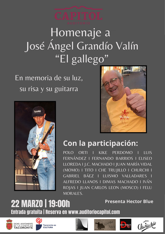 Gedenkveranstaltung für José Ángel Grandío Valín "El gallego". Termin: 19:00-20:00. Ort: Auditorio Capitol. Präsentiert von Héctor Blue. Teilnehmer: POLO ORTI, KIKE PERDOMO, LUIS FERNÁNDEZ, FERNANDO BARRIOS, ELISEO LLOREDA, J.C. MACHADO, JUAN MARÍA VIDAL (MOMO), TITO, CHE TRUJILLO, CHURCHI, GABRIEL BÁEZ, LUISMO VALLADARES, ALFREDO LLANOS, DIMAS MACHADO, IVÁN ROJAS, JUAN CARLOS LEON (MOSCO), FELU MORALES. «In Erinnerung an sein Licht, sein Lachen und seine enorme Großzügigkeit, Sensibilität und Engagement für die Musik und die Gemeinschaft».
