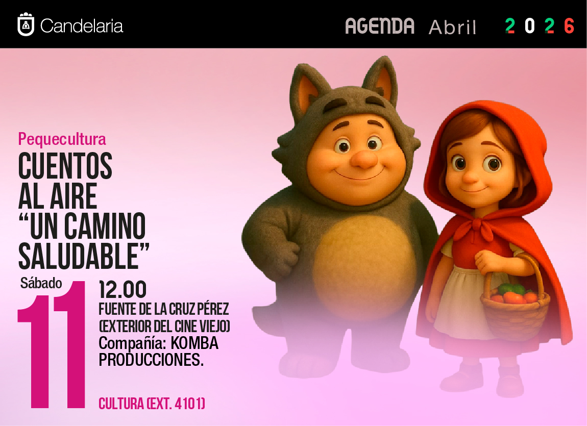 Event: CUENTOS AL AIRE “UN CAMINO SALUDABLE”. Date: 11 April 2026, 12:00–14:00. Location: FUENTE DE LA CRUZ PÉREZ (EXTERIOR DEL CINE VIEJO), Candelaria. Category: Culture. Company: KOMBA PRODUCCIONES.