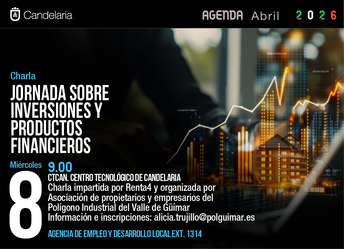 Workshop on investments and financial products. Talk by Renta4 and organized by Asociación de propietarios y empresarios del Polígono Industrial del Valle de Güímar. Date: April 8. Time: 09:00 - 12:00. Venue: CTCAN. CENTRO TECNÓLOGICO DE CANDELARIA. Information and registration: alicia.trujillo@polguimar.es For more information: Agencia de Empleo y Desarrollo Local at 922 500 800 extension 1314 Event Category: Economic Promotion and Employment.