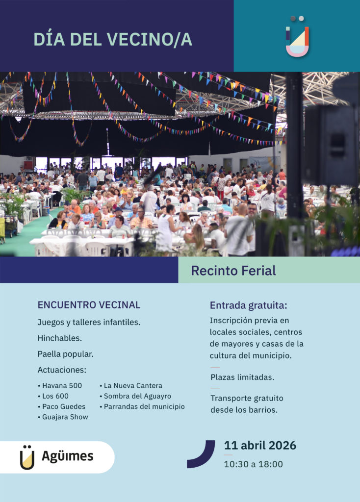 DÍA DEL VECINO/A es un día de convivencia comunitaria organizado por Participación Ciudadana en el Recinto Ferial de Agüimes. Fecha y hora: 11 de abril de 2026, de 10:30 a 18:00. Lugar: Recinto Ferial de Agüimes. Organizador: Participación Ciudadana. Detalles adicionales no especificados en el texto proporcionado.