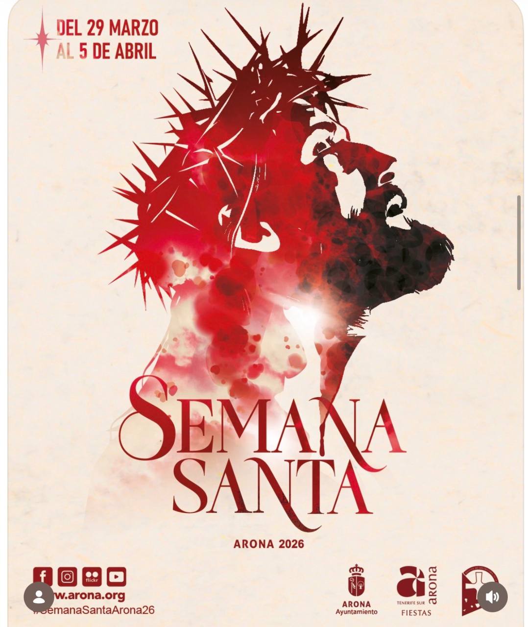 Semana Santa — Arona 2026. Festival religioso-cultural en Arona (Tenerife) del 29 de marzo al 5 de abril de 2026. Poster muestra el título SEMANA SANTA. Organizado por el Ayuntamiento de Arona (Arona Ayuntamiento) y Tenerife Sur / Arona Fiestas. Más información: www.arona.org.