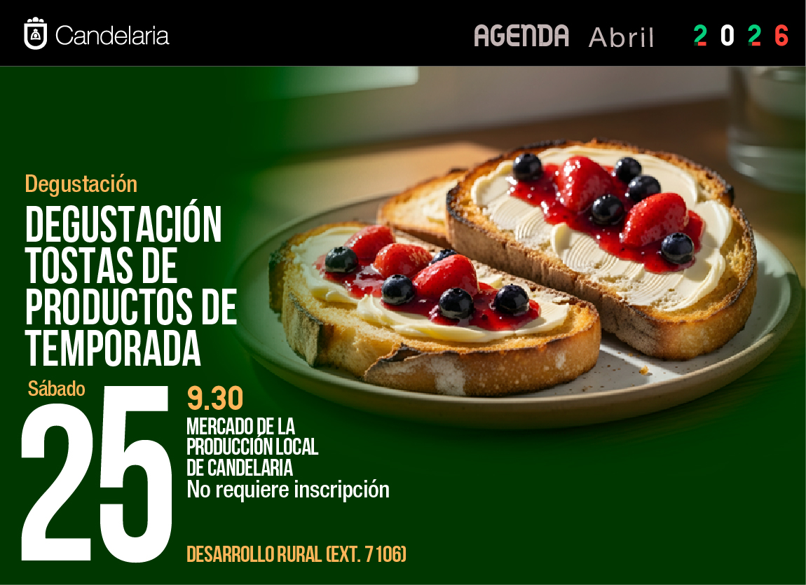 Degustación de Tostas de Productos de Temporada como parte del Mercado de la Producción Local de Candelaria. Fecha: 25 de abril. Hora: 09:30 - 13:00. No requiere inscripción.