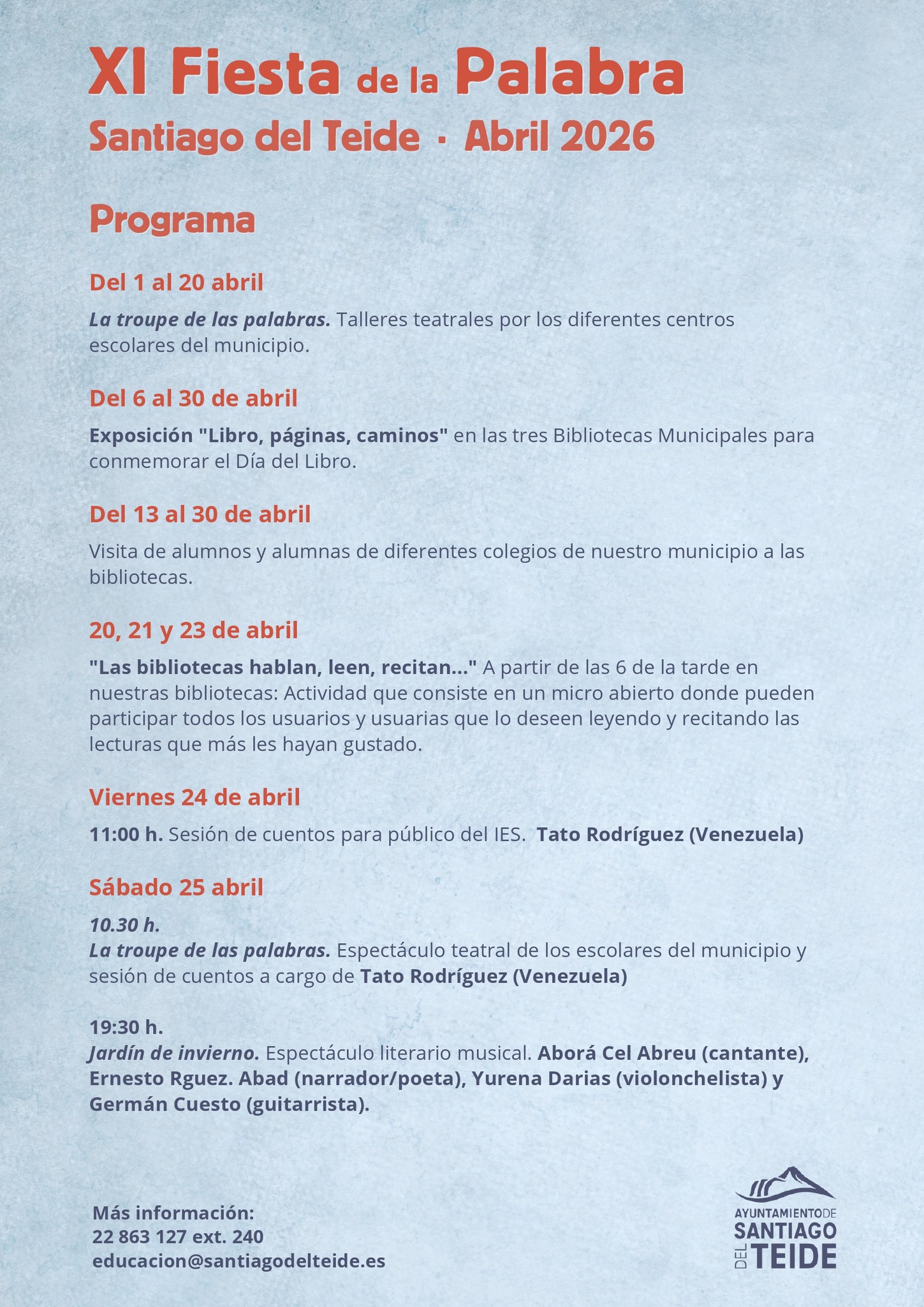 X I Edición de la Fiesta de la Palabra en Santiago del Teide – Sábado 25 de abril, en las instalaciones del CEIP Feliciano Hernández García. Actividades literarias destinadas a los más pequeños y a toda la familia. Horarios: