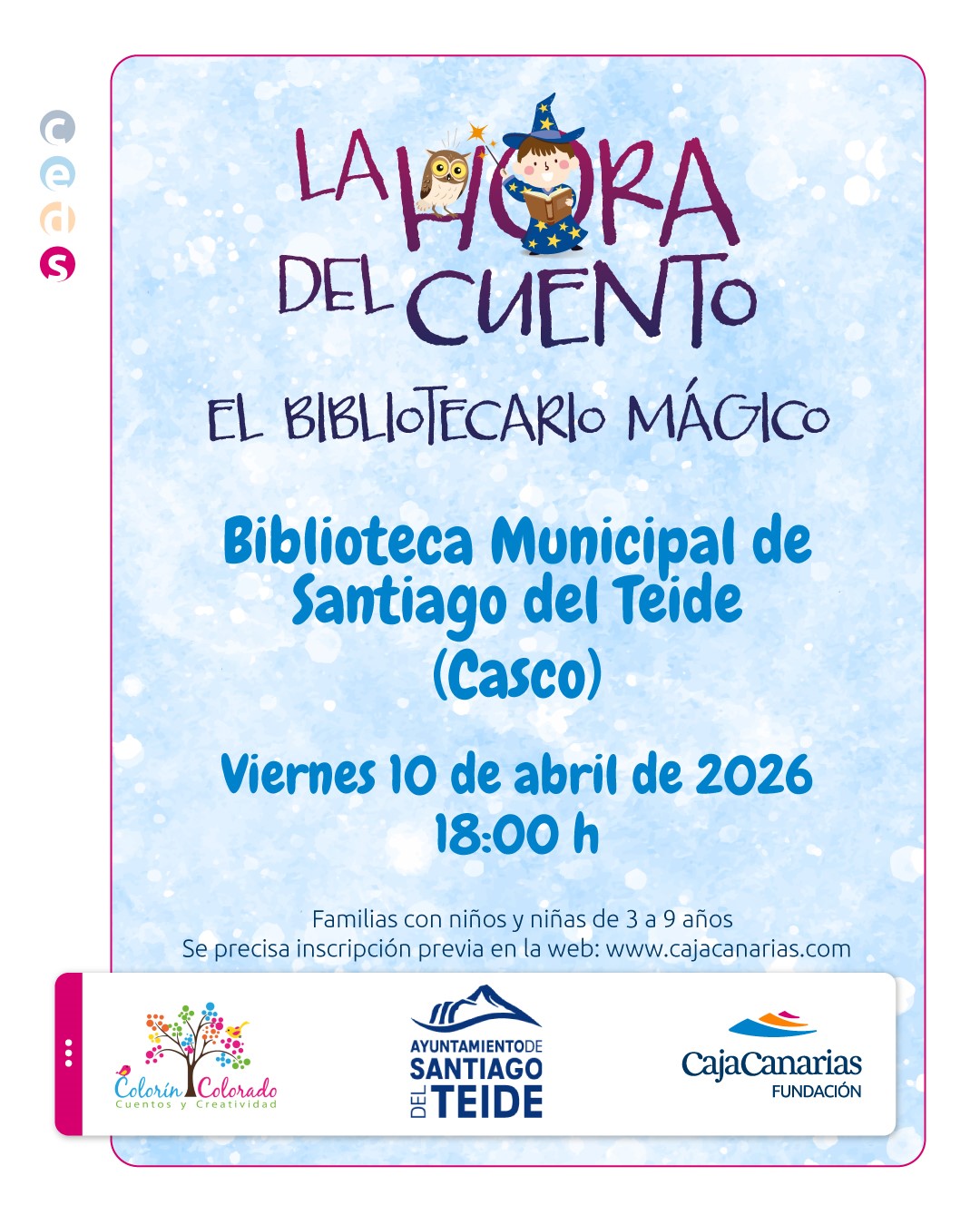 La Magia de los Cuentos Llega a Santiago del Teide. Narrador: Juan Carlos Toste. Biblioteca Municipal de Santiago del Teide (casco). Viernes, 10 de abril. 18:00h - 19:00h. Actividad gratuita para familias con peques de 3 a 9 años. Inscripción gratuita aquí: https://www.cajacanarias.com/agenda/la-hora-del-cuento-2026/?fbclid=IwZXh0bgNhZW0CMTAAYnJpZBEwa1J0cWFJa1dpY0Fib2NCRnNydGMGYXBwX2lkEDIyMjAzOTE3ODgyMDA4OTIAAR4fCyR8HcW_0kphxIz5r1kKN8UFIIqGnUiVFoXp7bU-TDDhcnqCOAzDzlPmzQ_aem_7v1soLRSZlX17sjekIvIpw