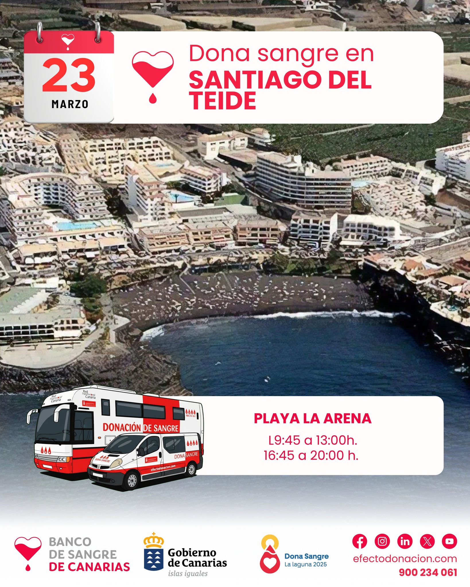 Campaña de donación de sangre en la Avenida Marítima de Playa de La Arena, Santiago del Teide. El próximo lunes 23 de marzo podrás colaborar con la campaña de donación de sangre que se realizará en la Avenida Marítima de La Arena. Horarios habilitados para las donaciones: