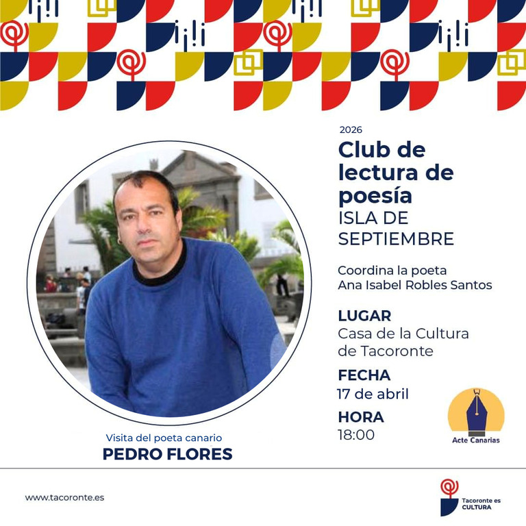 Club de Poesía Isla de Septiembre, coordonné par Ana Robles. Lieu: CASA DE LA CULTURE, Tacoronte. Date: 17 avril 2026. Heure: 18:00–19:00. Entrée gratuite. Public visé: Adultes.