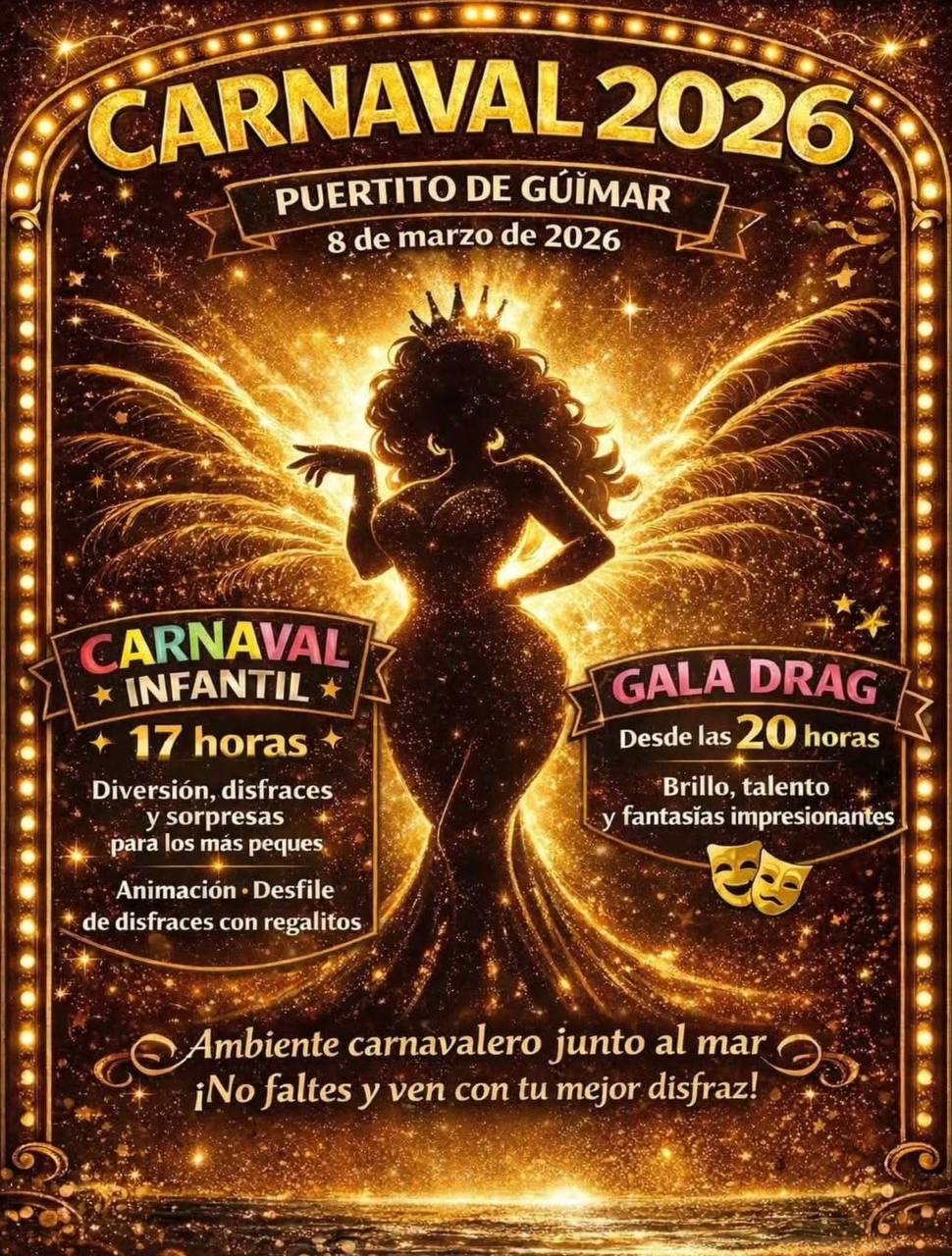 Rejoignez-nous pour Carnaval 2026 à Güímar ! Les festivités commencent le 6 mars à la Plaza de San Pedro avec des performances de Batucada et de Murga. Le 7 mars, profitez du Carnaval de Día avec la Comparsa Los Joroperos, Carmelo Salas, Tommy DJ, et plus encore. La célébration se poursuit le 8 mars au Puertito de Güímar avec un Carnaval Infantil à 17h00 et un spectaculaire Gala Drag à 20h00. Ne manquez pas le fun, la musique et les costumes vibrants au bord de la mer !